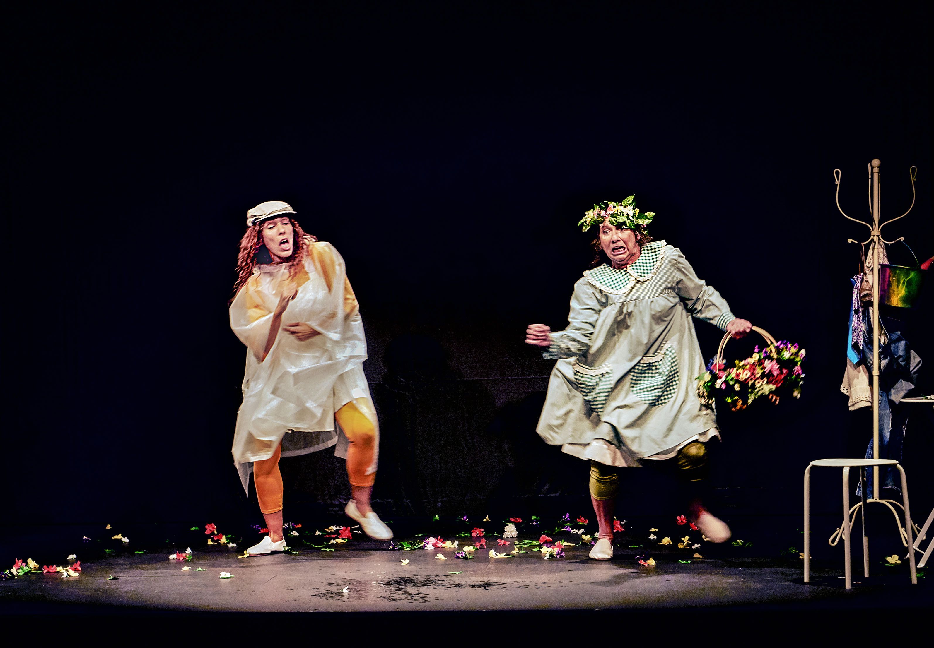 La proyección y música de "un globo, dos globos, tres globos" dan inicio a la obra en la que LAS CHAMANAS "Katia y Selma" celebran con el público el "cumplesiglo" de Gloria Fuertes.